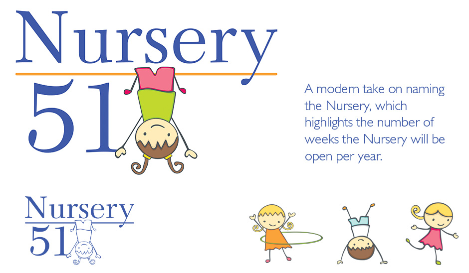 We came up with the name Nursery 51, which is not only unique when comparing it to the names of nurseries in general, but refers to the number of weeks the nursery is open every year, immediately appealing to parents that need full or part time day care for their children.