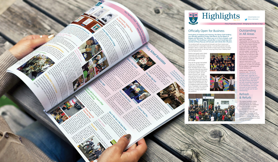 After spending time at Priory, gathering information from staff and pupils about sports events, concerts, special achievements and social occasions, we refreshed the title font and the overall look throughout the magazine. We write the copy and supply the printed magazine.